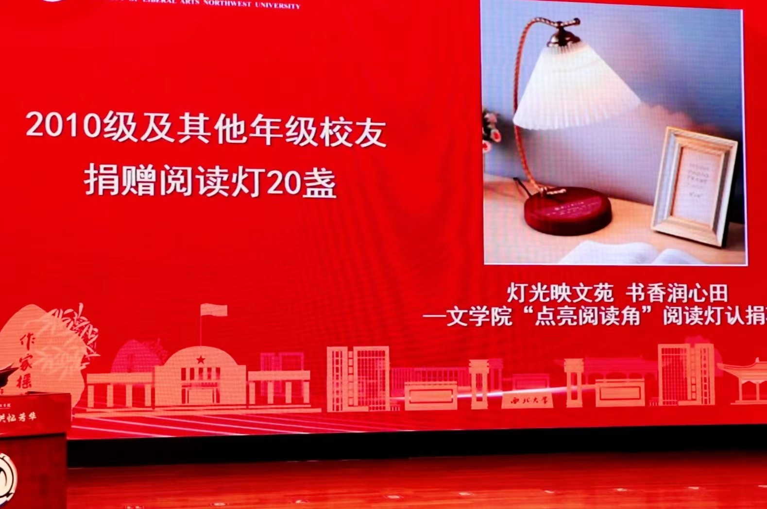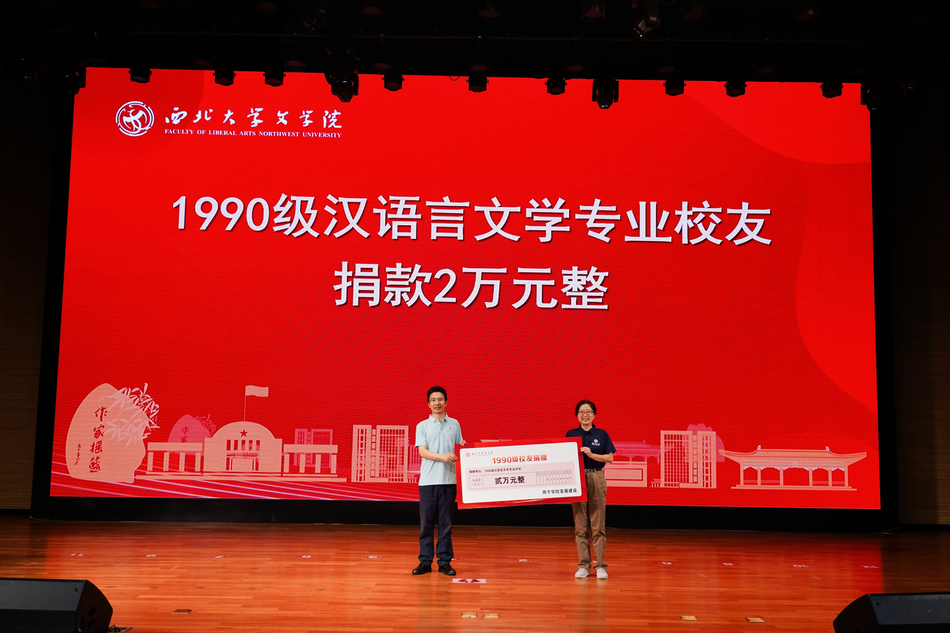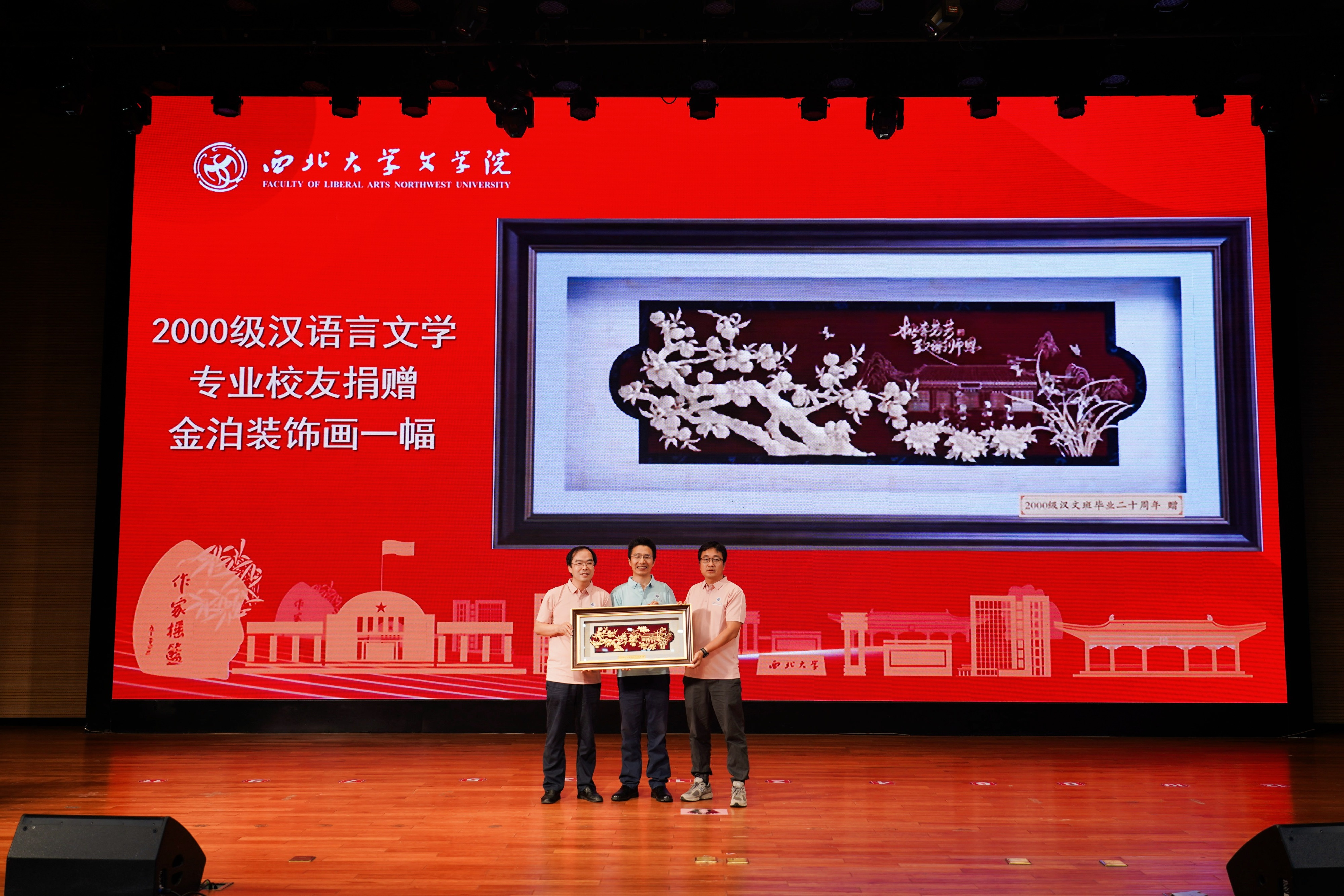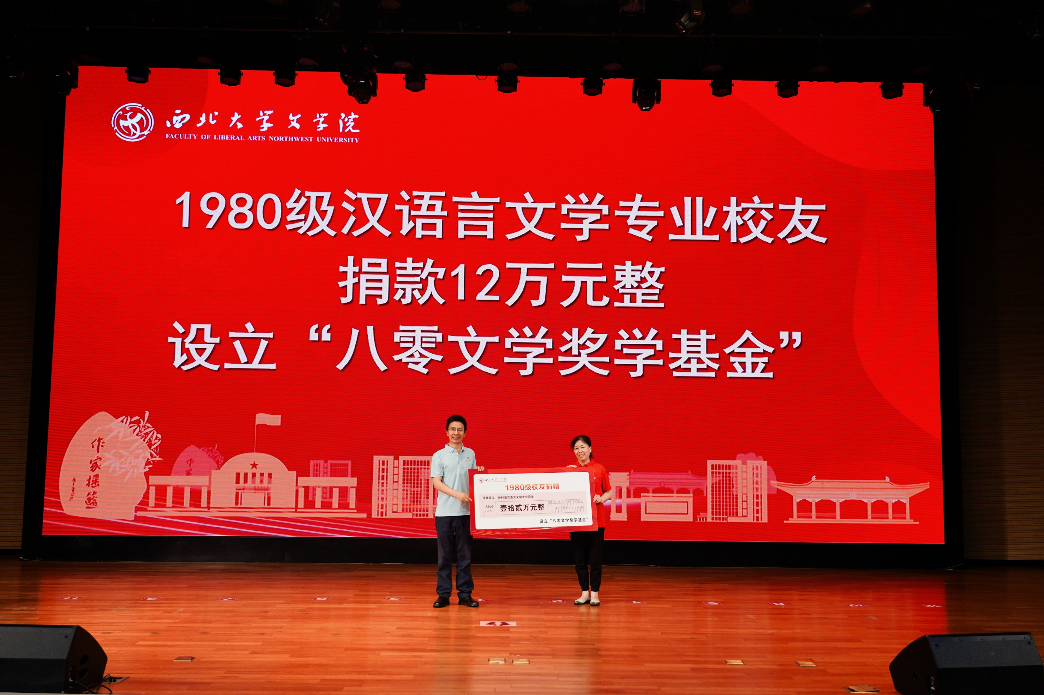 在当天下午举办的纪念大会上举行了返校校友捐赠仪式。其中1980级校友向学院捐赠人民币12万元整,设立“八〇文学奖学基金”,用于奖励在学业、学术研究、文学创作、社会服务等方面表现突出,体现学科综合素质的在校本科生。1980级校友柏一林镌刻印章三枚,赠送学院。1990级校友向学院捐赠人民币2万元整,用于学院发展建设。2000级校友向学院捐赠人民币3600元整,用于学院发展建设,同时向学院赠送金箔装饰画一幅。2010级及其他年级校友积极响应学院“灯光映文苑 书香润心田”---“点亮阅读角”阅读灯认捐项目,认捐阅读灯20盏,将摆放在76net必赢官网各阅览区。院长谷鹏飞代表学院接受了捐赠,并为捐赠校友颁发捐赠证书,对慷慨捐赠、襄助学院事业发展的热心校友表示感谢。