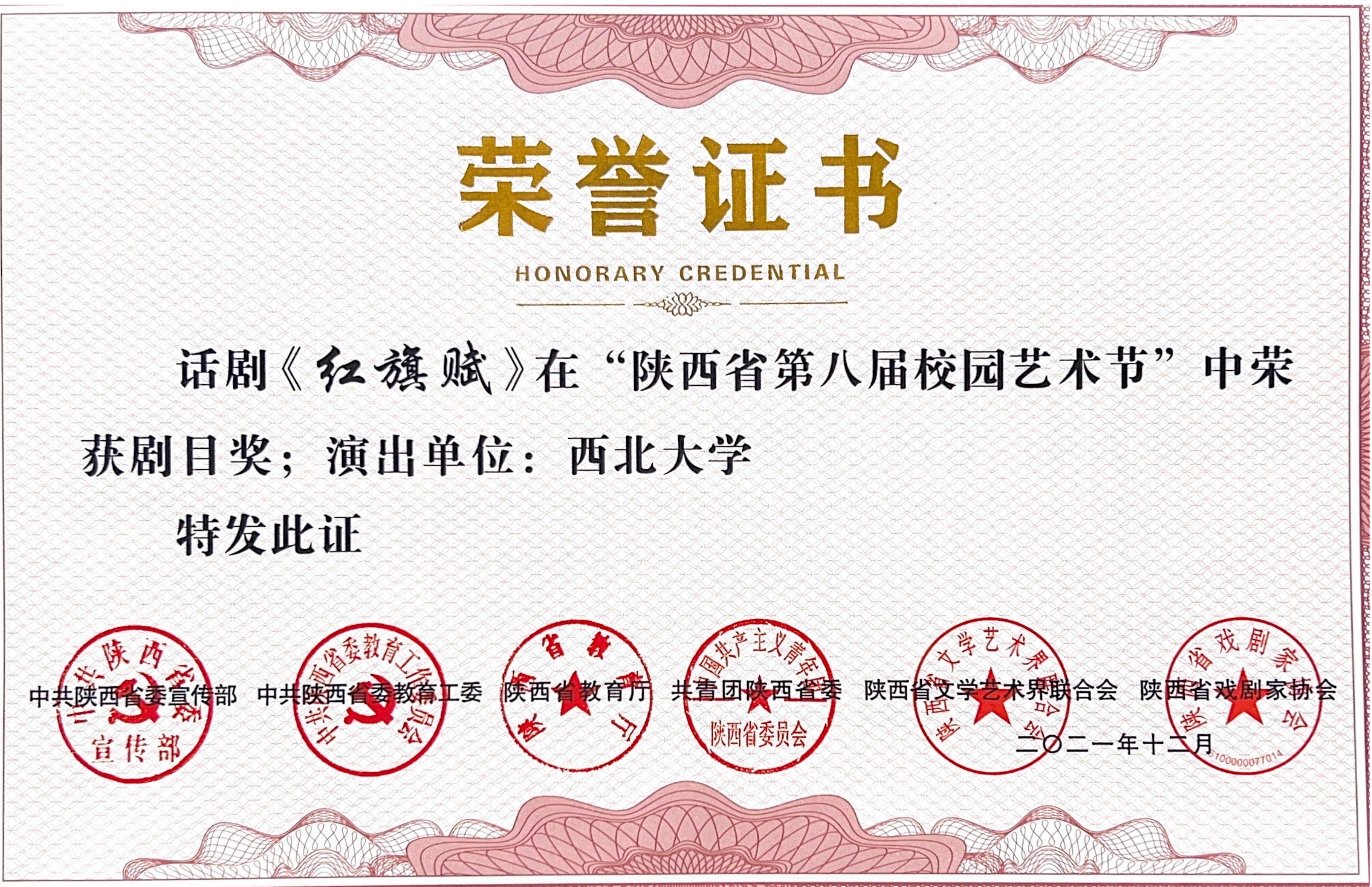 近日,由中共陕西省委宣传部、中共陕西省委教育工委、陕西省教育厅、共青团陕西省委、陕西省文学艺术界联合会、陕西省戏剧家协会共同主办的陕西省第八届校园艺术节获奖信息公布。我校荣获“优秀组织奖”,第34届“黑美人”艺术节原创剧目《红旗赋》获剧目奖,杨慧、蒲萍、林敬之、李龙杰、慎轩、闫帅行等6位同学获表演奖。