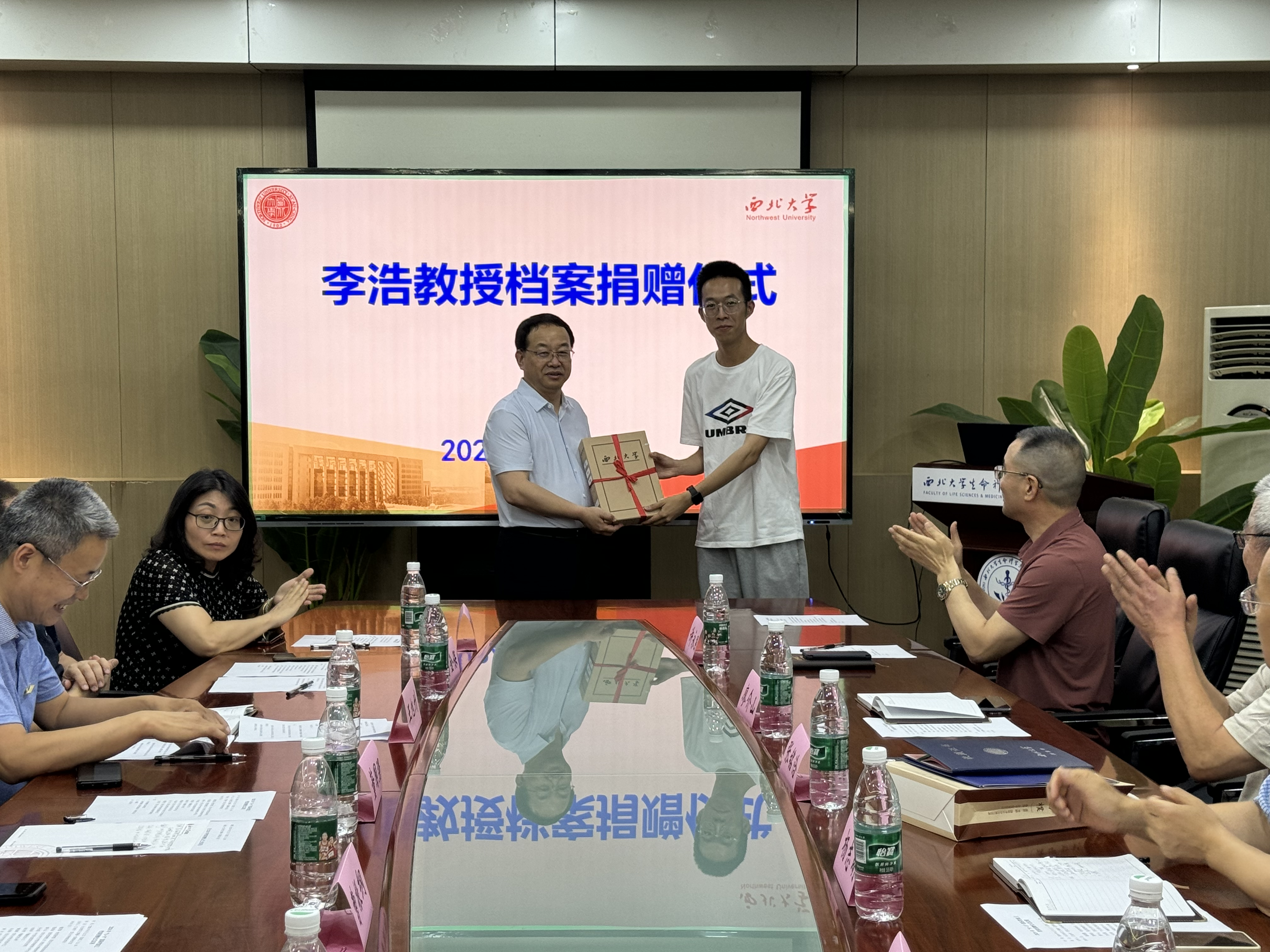 董国强代表学校接收了捐赠的档案,向张铭洽、李浩颁发了收藏证书并赠送了《西北大学大事记(2002-2022)》《西北大学学人谱 第四集(2012-2022)》《西北大学藏民国版权证图录》等。